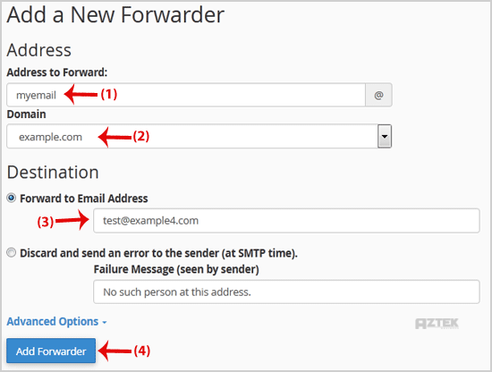 Step 3: On the "Add a New Forwarder" page you will see the "Address to forward:" field. If you want to forward your [email protected] to your custom e-mail address, enter "myemail" (without the quotes) in the "Address to forward" field, and should you have multiple domains, select the appropriate one from the domain drop-down list.