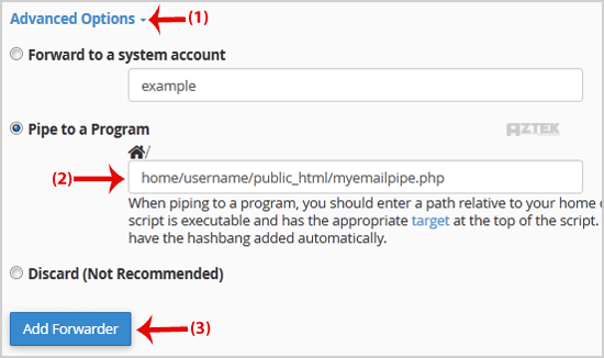 1. If you want to forward your email to an e-mail pipe script like myemailpipe.php, which is located on your public html folder like "/home/username/public_html/myemailpipe.php", follow Step 2 and Step 3.